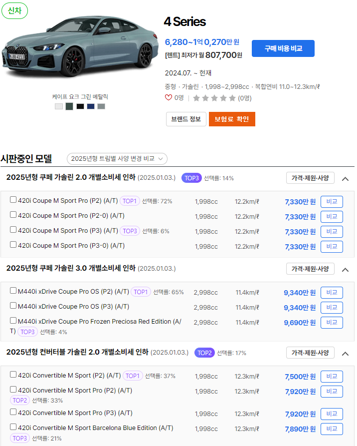 - 420i Convertible M Sport (2.0L 가솔린, A/T): 약 7,480만 원